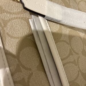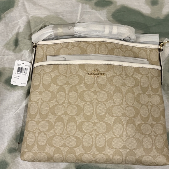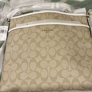 Coach crossbody in beige signature jacquard. White trim accents the top and pocket. Gold-tone logo hardware. Slim front pocket and zip closure. Perfect for hands-free everyday use.Authentic NWT with original complete packaging Coach model Signature File Bag Approx measurements 13.5 across Seam to seam. Length upright 11in. MSRP $225.
