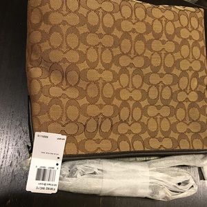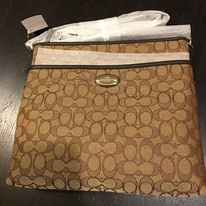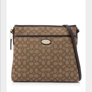 Material: Signature Fabric, Fabric LiningZipper Closure1 Zipper Pocket, 2 Open Slip Pocket12.5" L x 10" H x 2" DHardware: Gold. 48" strap
