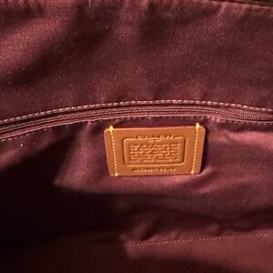 Chic Coach tote with signature pattern and floral design. Brown and pink hues. Ideal for stylish outings.