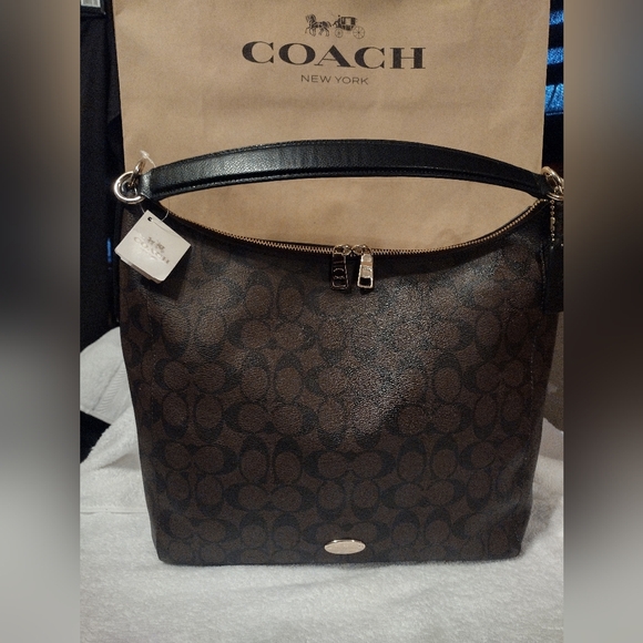 New with tag coach signature brown celeste handbag bag has never been used comes from smoke and pet free home hardware is gold this is a beautiful 👜 it's the hard wear that I love the most no scratches.12x11