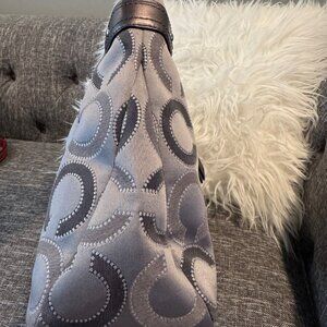 This authentic Coach Signature Hobo Bag features the timeless gray “C” canvas pattern with pewter leather trim and silver-tone hardware. The roomy, slouchy silhouette makes it perfect for daily wear while maintaining that iconic Coach sophistication.