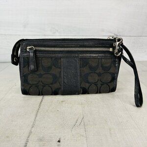 Coach Signature Jacquard Black Leather Trim 8"x4.5" Zip Pouch Wristlet Clutch