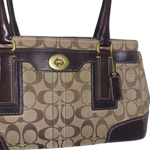 Step into timeless elegance with this authentic Coach Signature Satchel. Designed in the iconic Coach "C" jacquard canvas, this handbag is accented with rich dark brown leather trim and antique brass hardware for a classic, polished look. Featuring a structured silhouette with dual top handles, this satchel transitions seamlessly from everyday errands to professional settings.
