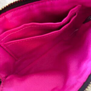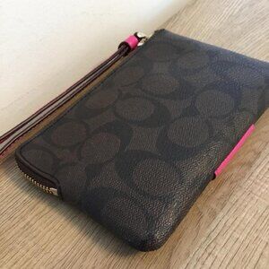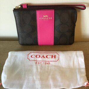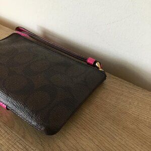 Coach Signature Leather Corner Zip Wristlet Brown with Pink Band and Dust Bag