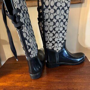 Coach Signature Logo Brown Tall Rain Boots with Lattice Lace Up Back Closure