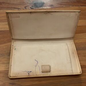 Coach checkbook cover with classic, beige signature, logo print and leather. Exterior is very clean and looks great. Interior has pen marks from use. See photos. Pre-owned with some signs with signs of use.