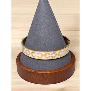 This Coach Signature Metal Enamel and Crystal Bangle from the mid 2000’s features a gold signature design on a light pink background with crystal details. This bracelet would look great with any outfit and if you love the quality and style of Coach, you need this in your collection!