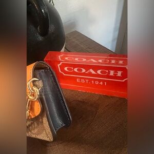 This Coach Mini Card wallet is crafted in their signature coated canvas and smooth orange leather on the flap. The interior is all leather and features a main compartment with a slip pocket on the front. The exterior has a slip pocket on the backside. This mini wallet has great compartments and can be carried on its own or attached to another bag! The gold chain adds beauty to this piece!