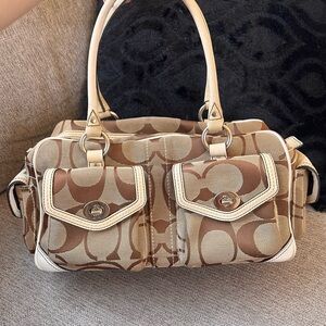 Elevate your style with the Coach Signature Handbag in brown and cream. Perfect for any occasion, this bag combines elegance with functionality.