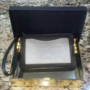 Elegant Coach signature wristlet. Black and brown leather with platinum accents. Perfect for any occasion.