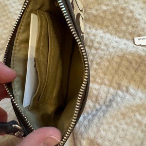 Tan colored wristlet with brown leather handle and gold hardware, never used-brand new condition, great for nights out!