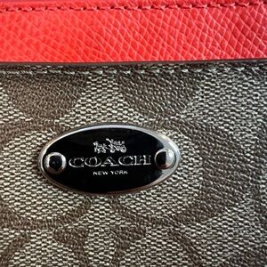 This Coach Pop Pouch is a stylish addition to any outfit. The traditional Coach logo pattern and coral handle/strap color add a pop of color to the khaki exterior PVC material. The pouch features a zip closure and faux leather handle/strap material. The interior lining is made of fabric and also comes in coral, adding a coordinating touch. The silver hardware color complements the overall design. This small clutch-style pouch is perfect for carrying accessories and is part of the Coach Pop Pouch product line.