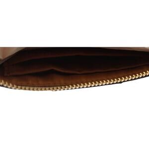 Signature perforated leather Two credit card slots Zip-top closure, fabric lining Wrist strap attached