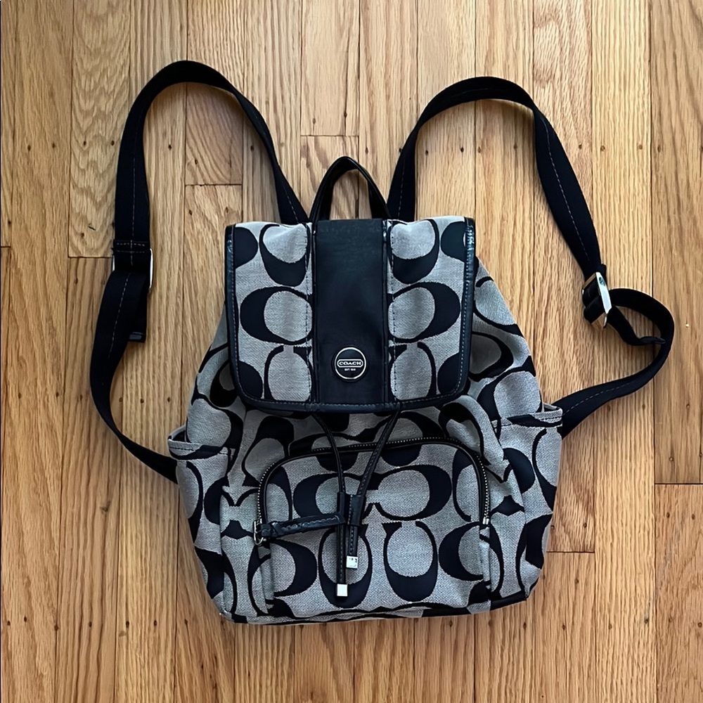 Chic Coach backpack with signature black and gray pattern. Includes adjustable straps and front pocket.