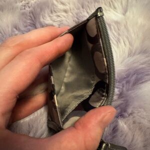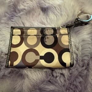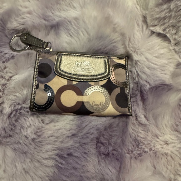 Elegant Coach wallet with signature pattern. Features keychain attachment and secure closure. This is a very small “skinny wallet” with a keychain attached. It’s a vintage piece brand Details and Features: Outer: Fabric with leather trim Lining: Fabric Exterior slip pocket, zip-side closure with key ring Original tag attached Approximate Measurements: Height 3", Width 4.5", Depth 0.5". Purple. Sequences. Stagecoach. Silver. Look in my closet I have her mother she matches. Pristine like new. Good piece of vintage.