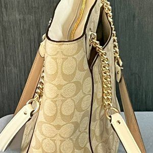 This Coach cross grain leather bag in the Signature Tan C Pattern has gorgeous gold chain and leather handles, making this bag one of the classiest looking Coach Bags you can ever own. Large enough to carry all of the essentials and then some! The bag practical enough for daily use and elegant enough for special occasions. The bag is very gently used and cared for, however, there is 1 small faint ink mark on the inside on the closure leather, otherwise the bag is in perfect condition. Measured at the base the bag is 14"L x 10" H x 4"W with a 12" handle drop with the signature gold feet to keep the bottom of the bag protected.