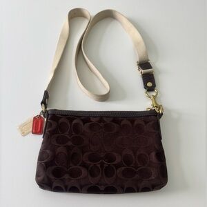 Classic Coach "Poppy" Signature Swingpack Crossbody Purse. Coach Signature chocolate brown jacquard lurex fabric with chocolate brown leather trim adjustable natural cotton webbed shoulder strap with polished brass dogleash clasp. Front exterior full-depth zipper pocket with polished brass loop pull, gold metallic leather embossed Coach Poppy patch at front & center top zip closure, interior multifunction pocket, purple satin interior. Two Coach signature hangtags *Measures approx: 9"(W) x 6"(H)
