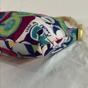 Coach Poppy Signature Crossbody Bag, featuring the iconic multi-color pattern with vibrant purples, blues, greens, and pinks. This bag is perfect for adding a pop of color to any outfit! It includes adjustable strap and gold-tone hardware. The interior is lined with a soft magenta fabric and includes a leather Coach creed patch (Style #F19454).