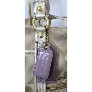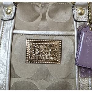 The Coach Signature Poppy Spotlight Tote shoulder bag in Khaki is a stylish and practical accessory for women. This shoulder bag features a canvas exterior with gold hardware accents and double handles made of leather in a striking gold color. The interior is lined with satin in a beautiful blue hue, adding a touch of luxury to the design. With pockets for added functionality, this Coach Poppy model combines sophistication and convenience in one elegant package. Perfect for everyday use or special occasions, this tote shoulder bag is a versatile and chic addition to any wardrobe.