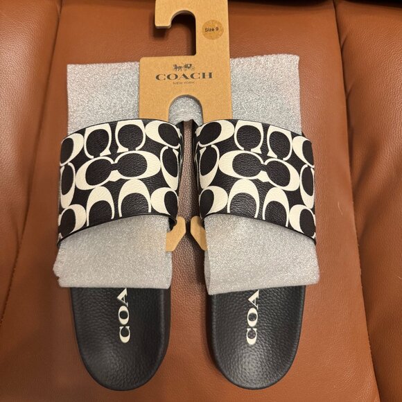 Coach Signature Print Slide Sandals NWT Mens size 9 Black & White. Please see all photos as they are part of the description. Comes from smoke free home.