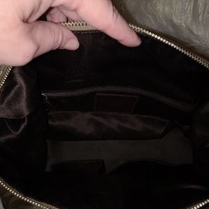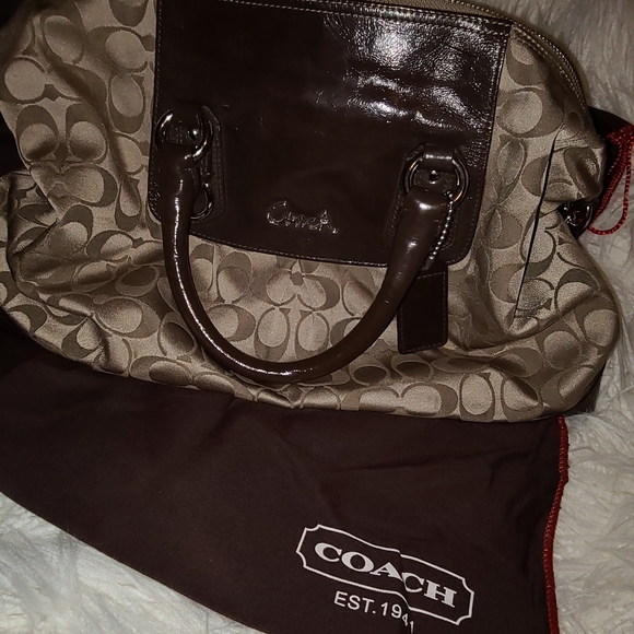Fairly large Coach purse that's satin tan with dark brown C's. Has 1 large compartment with an inside pocket. It's in good condition and has been stored in a cedar chest in its own bag.