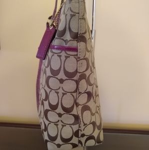 Coach khaki, brown and raspberry. Signature canvas with raspberry Python embossed leather trim Beautiful summer colors. Inside wine color lining with 2 open pockets and 1 zippered pocket. Full length outside snap pocket. Straps 8 1/2" drop purse measures 13" x 10 1/4" x 4". Just in time for summer! Like New condition!