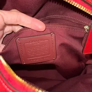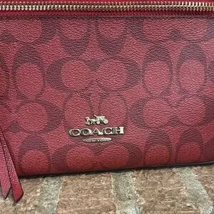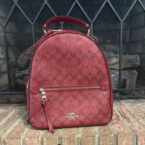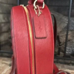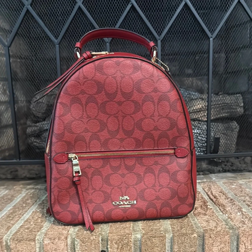 Elegant Coach backpack with signature pattern. Features front zip pocket. Includes top handle and adjustable straps.