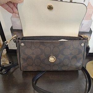 Coach signature reversible Black and white crossbody bag combines elegance and functionality with its sleek black and brown design. Crafted for versatility, it is perfect for daily use or special occasions. The bag's compact size and adjustable strap make it a stylish and practical choice for any outing.