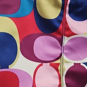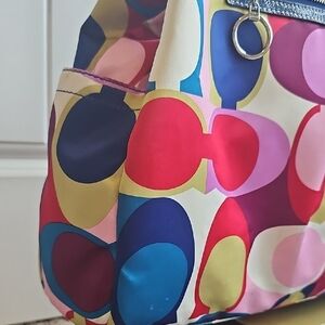 Stylish Coach shoulder weekender bag with a vibrant Signature C multicolor pattern. Features durable straps and a spacious interior.