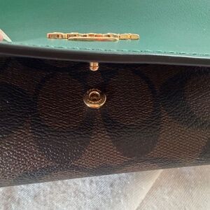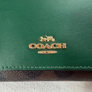 Coach Signature Slim Trifold Snap Wallet in Brown Canvas/Dark Pine