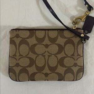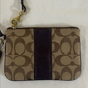 Elegant Coach wristlet with iconic pattern. Features tan and purple hues. Perfect for any occasion.