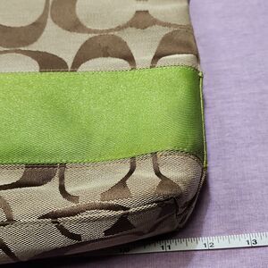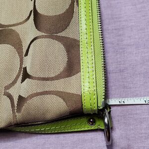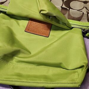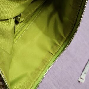 Top zip closure, silver-tone hardware, fabric lining with interior slot pockets, and zip pocket