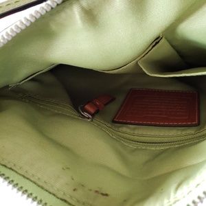 Coach Signature Bag with Lime Green stripe coloring. Has two straps with different lengths, and can be converted to a crossbody or a shoulder bag.