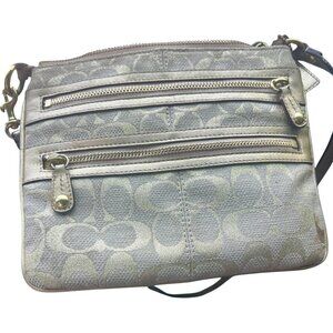 100% authentic Coach Signature Stripe Metallic Crossbody in a soft gold jacquard with matching metallic leather trim and iconic Coach hangtag. Features two front zip pockets, a rear slip pocket, top zip closure, and a pop-of-color lime satin interior with multifunction slip pocket. Finished with an adjustable crossbody strap and gold-tone hardware.