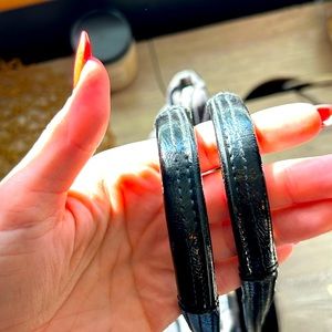 Very clean and well taken care of smaller tote. One outside open pocket with snap closure. Interior is clean with no staining. One zip and two open pockets. Handles are great.