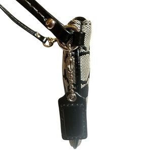 This elegant Coach wristlet showcases a sophisticated black color palette, highlighted by a signature pattern that exudes timeless style. The compact design features a convenient wrist strap, making it an ideal accessory. Crafted with attention to detail, this wristlet is a perfect blend of functionality and fashion.