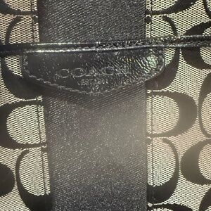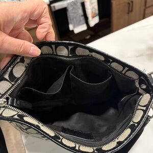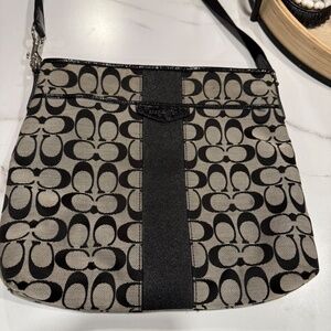 • Authentic Coach Signature Stripe Swing pack (style #F28502) in brown jacquard canvas with the classic “C” logo print.