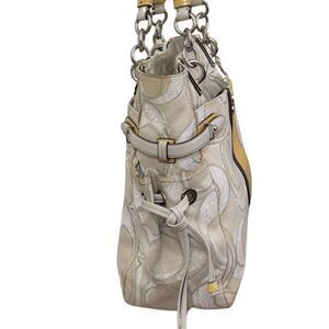 Pre-owned Coach Signature Stripe Tote Bag in beige and gold.