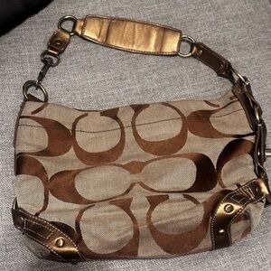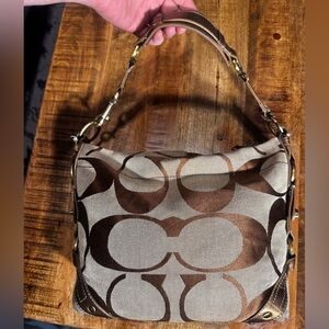 Coach Signature Tan & Brown logo Canvas Gold W Leather Hobo Handbag Shoulder Bag