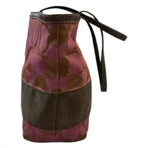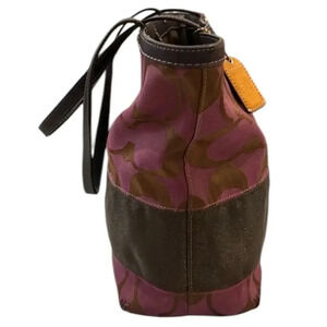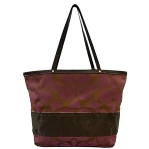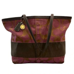 Elevate your style with the Coach Signature Tote Bag. Featuring a chic brown and purple design, this bag is perfect for any occasion. Enjoy the luxury and functionality of Coach.