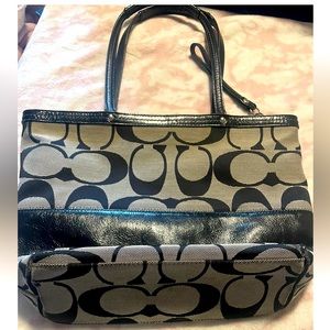 Stylish Coach Signature tote bag. Features signature pattern. Durable leather accents. Perfect for everyday use.