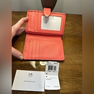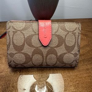 Coach Signature Wallet in khaki/coral. Minor signs of use on card slot (in last picture), otherwise in excellent condition!