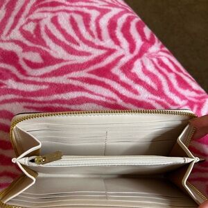 Elegant Coach wallet with signature pattern. Features beige and white tones.