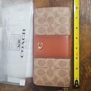 Elegant Coach wallet with signature pattern and popular tan/rust colorway.