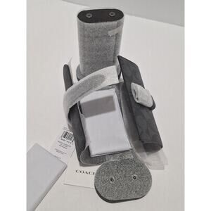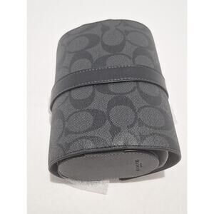 Authentic Coach signature watch case in charcoal/black coated canvas with leather trim. Features roll-style design, snap closure strap, interior space for 1 watch, soft lining, and embossed Coach New York logo. Includes original tag showing style CR404 QB/Charcoal/Black (10011161US25). Comparable value $228 USD / $280 CAD.
