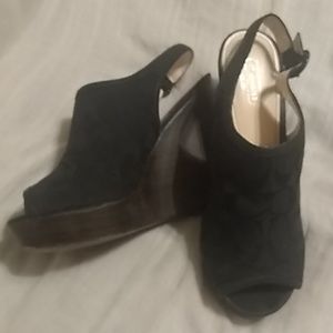 Pre loved Black Signature Coach Wedges w/ Leather Back strap and mahogany wedge (black on black design) These shoes are used, but still have a lot of wear left in them. Very comfortable and flirty😍