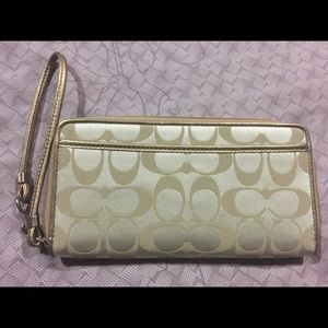 New w/o tags Coach wallet/wristlet in signature jacquard with gold leather trim. Never been used before, in brand new condition with authentication card inside. 💯 Authentic. 🚫Trades. Fair offers considered only.
