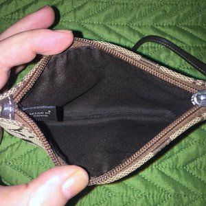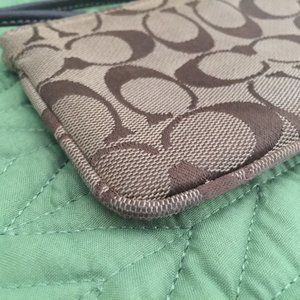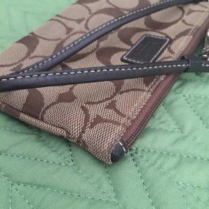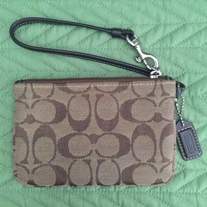 Coach signature brown fabric with dark brown leather wrist strap, silver hardware