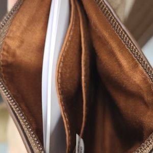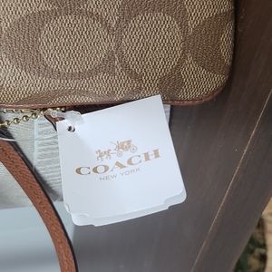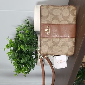 Elevate your everyday essentials with the Coach Signature Wristlet in Khaki and Saddle.