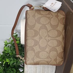 Crafted from signature coated canvas with crossgrain leather details, this wristlet is both stylish and functional. It features two credit card slots, a zip-top closure, and a convenient wrist strap attached. Measuring 6 1/4" (L) x 4" (H) x 1/2" (W), this brand new wristlet is perfect for carrying your essentials on the go.